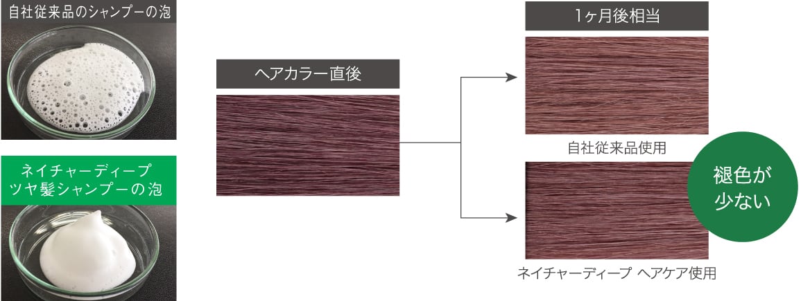 濃密な泡が、ヘアカラー後のデリケートなキューティクルをいたわって洗うので、ヘアカラーの染料の流出をおさえます。